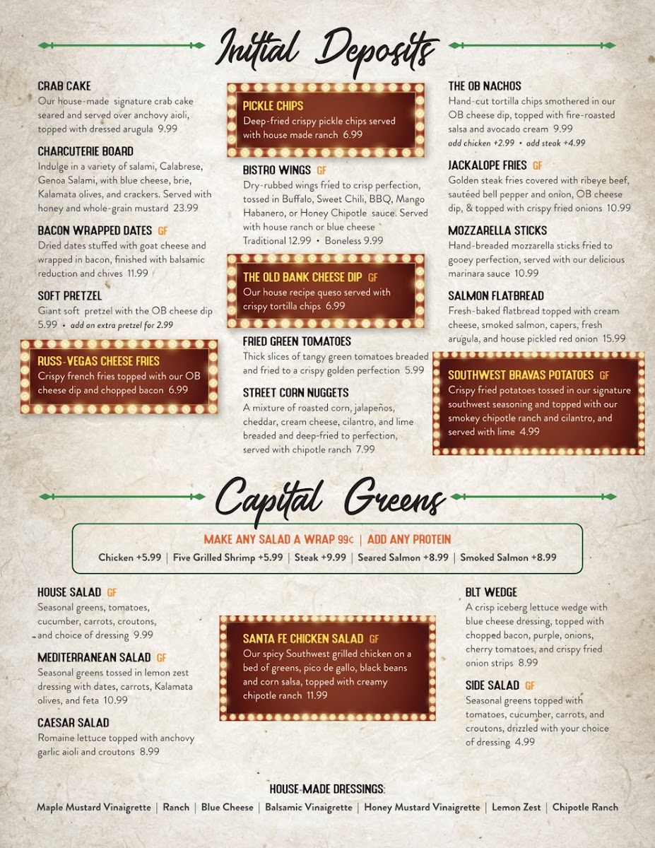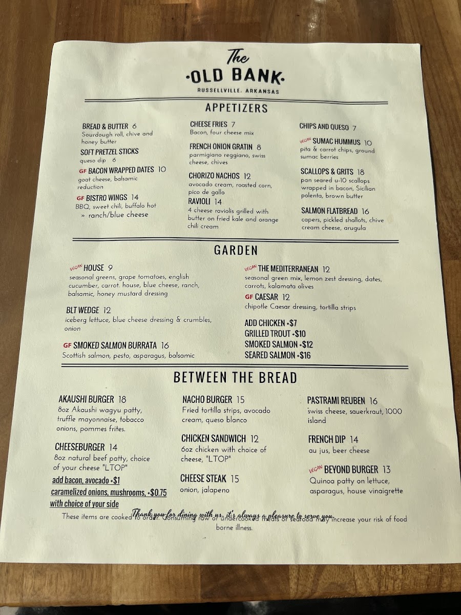 If you're looking for a place that combines delicious food with a warm, inviting atmosphere, look no further than The Old Bank Menu. Located at 218 W Main St in Russellville, AR, this local favorite offers a wide variety of mouthwatering dishes that are sure to satisfy any craving. Whether you're in the mood for a hearty lunch, a light dinner, or just a quick bite, The Old Bank has something for everyone. From flavorful appetizers to fresh salads, juicy steaks, and indulgent desserts, the menu is filled with options that highlight both classic comfort food and unique twists on traditional favorites. The cozy ambiance makes it the perfect spot for a casual meal with friends or a relaxed date night. Every dish is crafted with care, using high-quality ingredients to ensure that each bite is a memorable experience.