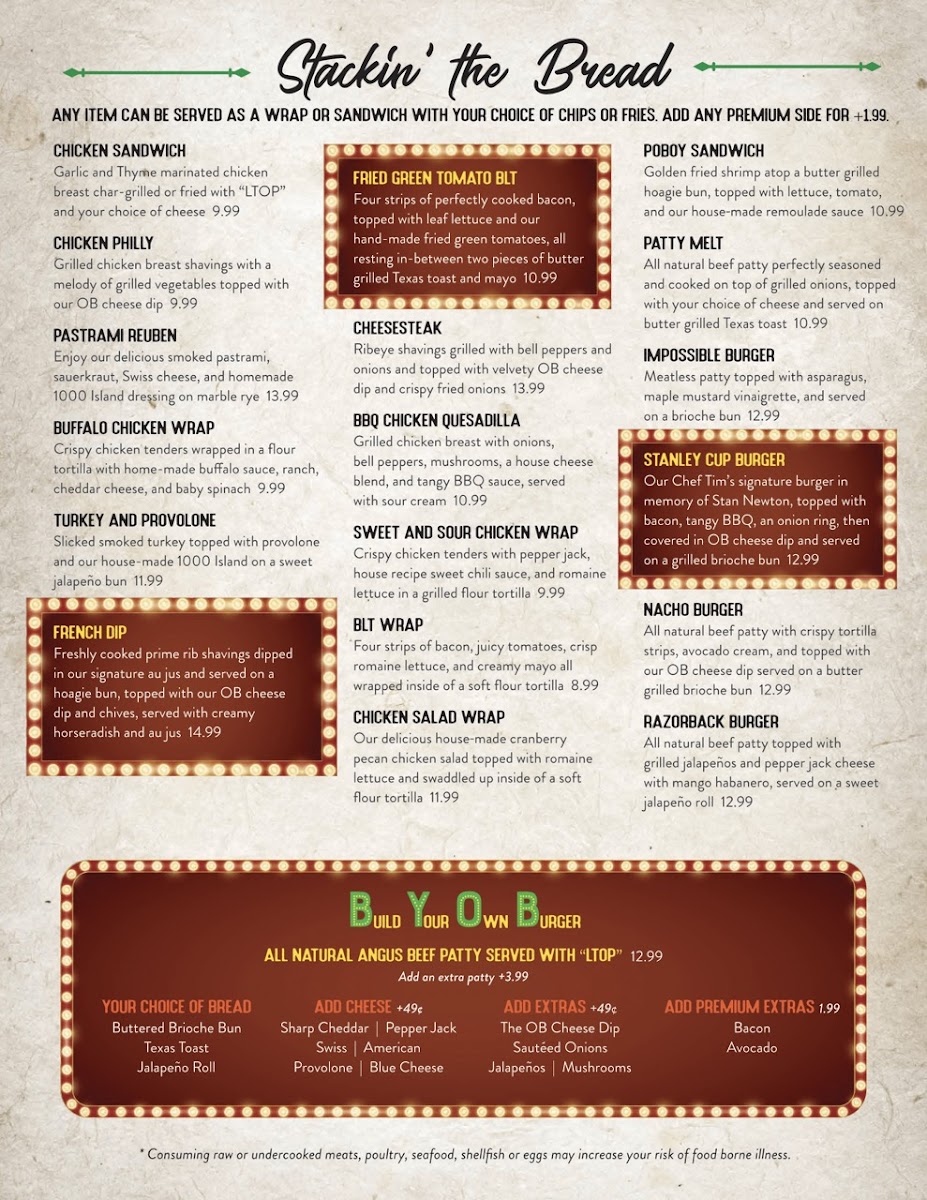 Our chef Tim's signature in memory of Stan Newton's favorite burger. topped with The OB cheese dip, house BBQ sauce, onion rings and bacon on butter brioche bun